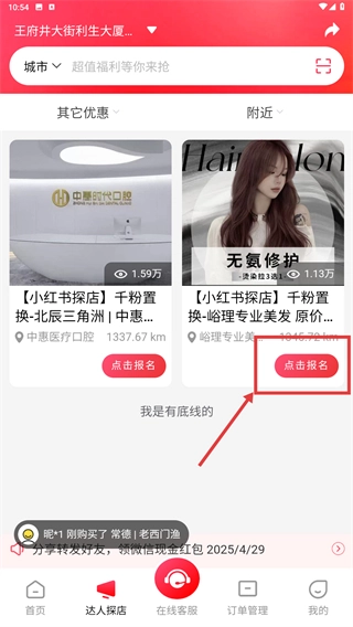 在探店推荐列表里找到你想参加的活动,点击【点击报名】按钮,就能进入对应的商家活动详情页面,然后就可以参与优惠活动啦。