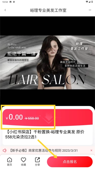 在商家详情页面,先确认活动相关信息(比如0元享受原价558元的染烫拉服务这类内容),接着点击页面底部的【点击报名】按钮,就能完成该优惠活动的参与步骤。
