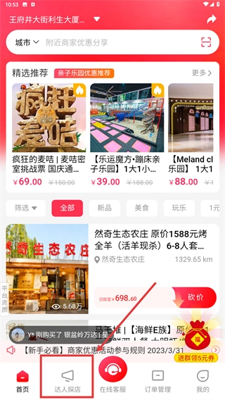 在首页底部找到【达人探店】入口并点击,进入探店专区后,就能浏览商家优惠活动以及各类探店推荐内容。