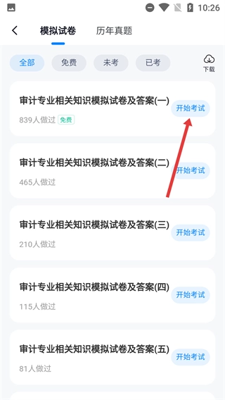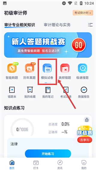 在【初级审计师】首页找到【模拟试卷】的功能入口并点击,就能进入模拟试卷选择页面,进而进行试卷练习。