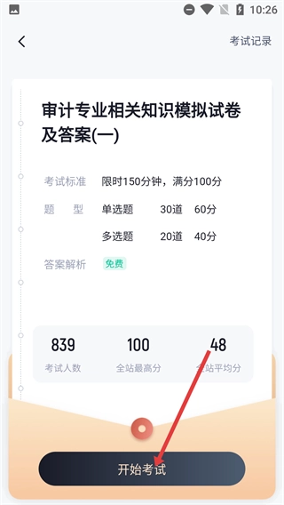 在【审计专业相关知识模拟试卷及答案(一)】的详情页面,先确认考试标准,再点击页面底部的【开始考试】按钮,即可进入答题环节。