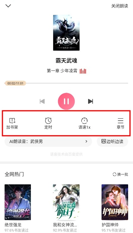 听书界面可以设置定时、语速等功能。