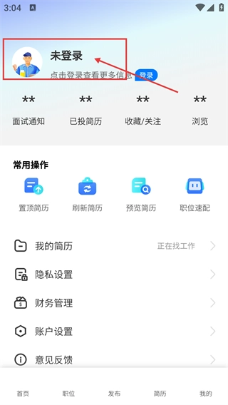 进入【我的】页面后,要是页面显示【未登录】状态,就需要点击【登录】按钮,这样才能查看面试通知、已投简历等和个人求职相关的信息。