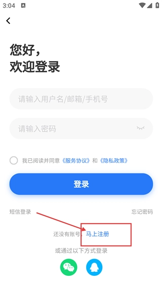 进入登录界面后,要是还没有账号,可以点击【马上注册】按钮,这个页面提供账号密码、短信、微信等多种登录和注册的途径。