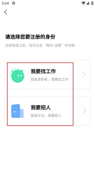 注册的时候得选择身份,找工作的人要选【我要找工作】这个选项,企业就选【我要招人】选项,注册完成之后,可以在【我的-设置】里面切换身份。