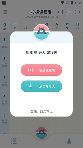柠檬课程表提供两种课表导入方式,一是创建课程表,二是通过口令导入。