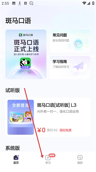 进入【斑马口语】的首页后,点击底部导航栏中的【学习】选项,即可进入对应的页面。