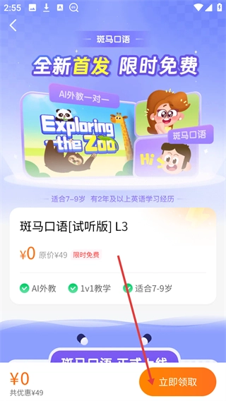 在课程详情页面,先确认【斑马口语[试听版]L3】的适配信息,之后点击【立即领取】按钮。