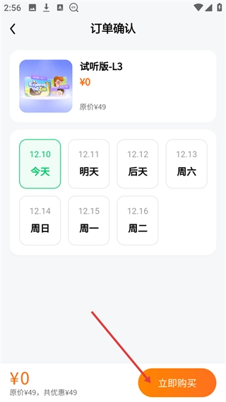 进入订单确认页面后,挑选学习日期(例如【12.10-今日】),接着点击页面底部的【立即购买】按钮,就能完成这门0元课程的领取流程。