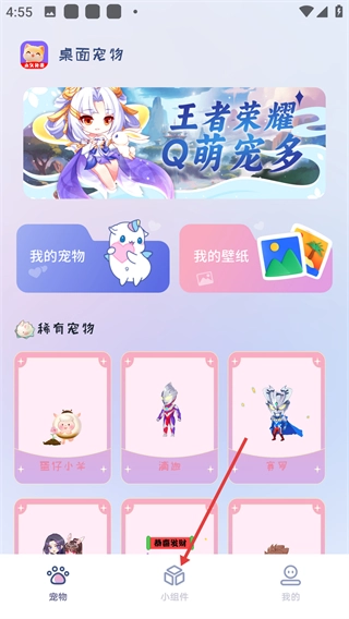 在【桌面宠物】的主界面里,点击底部的【小组件】选项,就能进入桌面组件配置页面,进而切换到组件管理功能。