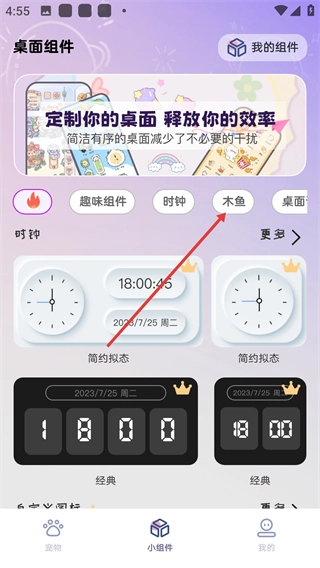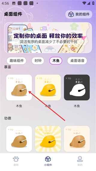 进入桌面组件页面后,点击【木鱼】分类标签,就能筛选出木鱼类组件,方便用户挑选对应功能的桌面组件。