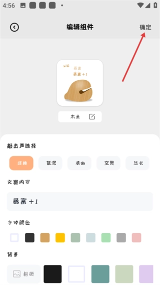 在组件编辑界面,你可以自定义敲击音效、显示文案、字体颜色等各项参数,完成设置后点击右上角的【确定】按钮,就能把这个组件添加到手机桌面上了。