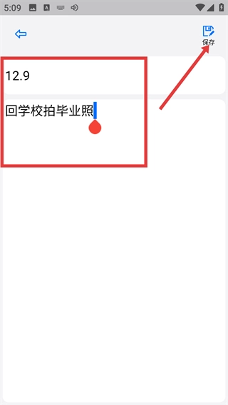 在笔记编辑页面,输入内容(例如【回学校拍毕业照】)后,点击右上角的【保存】按钮,就能完成当前笔记的保存操作。