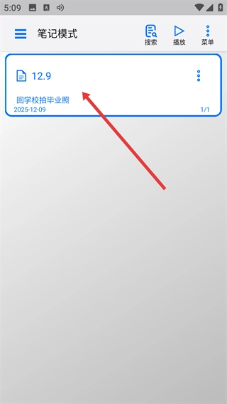 保存笔记后,在【笔记模式】列表中能查看已存储的笔记(包含日期【2025-12-09】),还可以开展后续的管理操作。