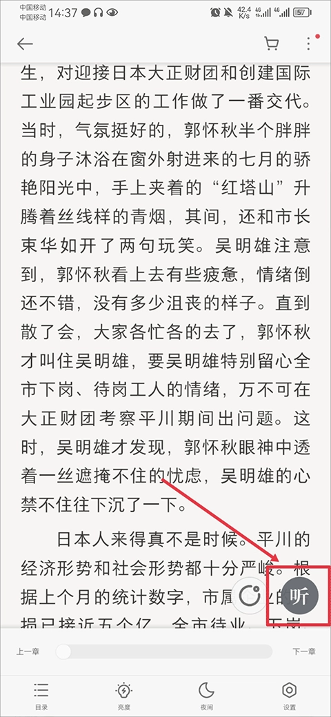在书籍阅读界面中,轻点屏幕即可调出功能菜单,随后点击右下角的听字按钮即可。