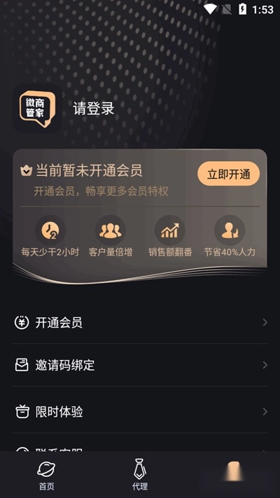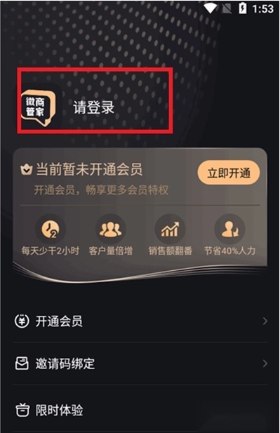 打开微商管家后,进入“我的”页面,点击登录按钮,支持使用手机号或者微信号进行登录操作。