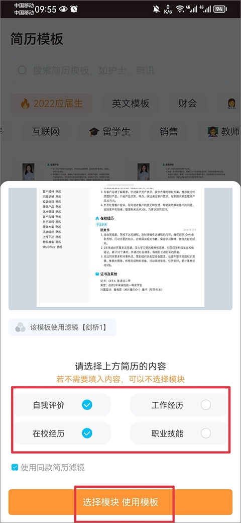 然后在模板简历里挑选你想填入的内容,要是不需要填入内容的话,也可以不选择相应模块。