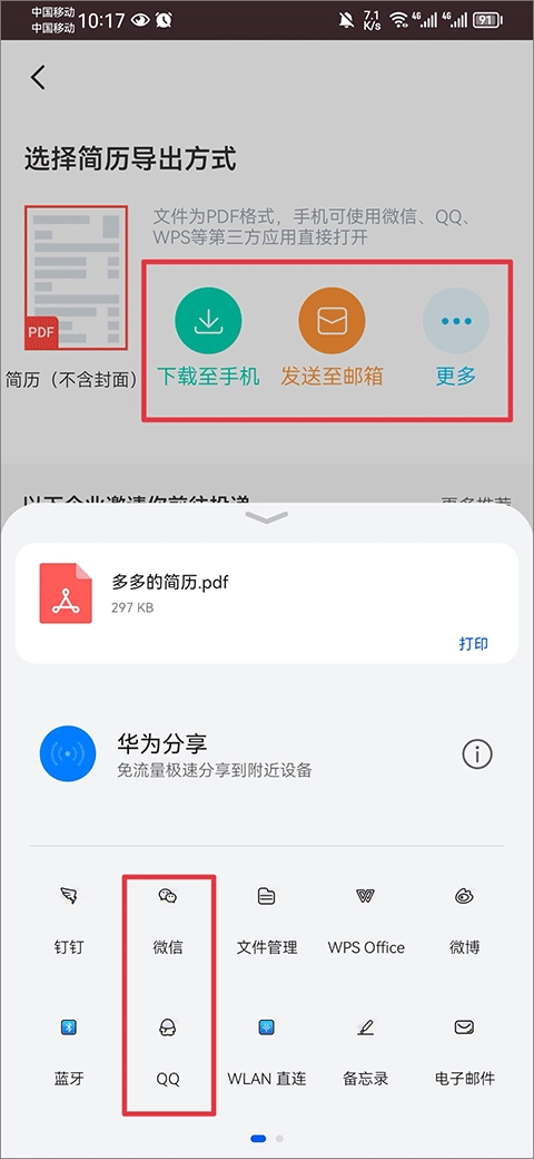 在选择简历导出方式时,你既可以直接点击导出,也可以选择发送至邮箱;若想通过其他渠道分享,还能点击“更多”选项,将文件发送到微信、QQ等平台。