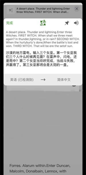 接下来点击“共享”按钮,在下方的软件列表里找到“翻译”并点击,系统会自动弹出翻译界面。之后我们选择好需要翻译的目标语言,系统便会自动完成双语对照的翻译呈现。