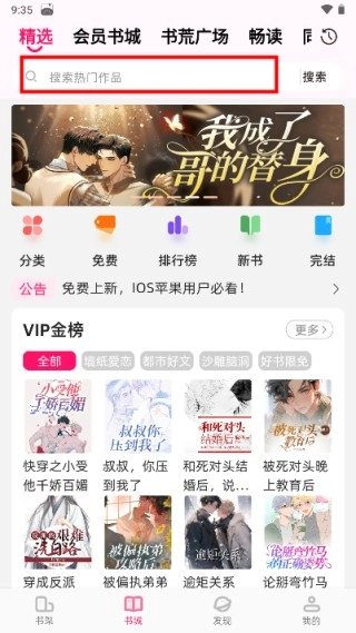 打开海棠书城App后,进入书城首页,点击搜索栏就能通过书名来查找书籍。