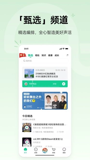 芒果动听构建了「甄选」加「相处」「健康」「知识」「成长」的“1+4”内容生态矩阵。通过综合性智能算法与人工编排相结合的方式打造甄选频道,而深度垂直的四大频道内容则紧密契合用户的收听需求。