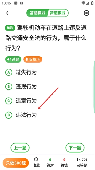 在答题页面,阅读题目后选择对应的选项(例如本题选择【违法行为】),即可完成该题的作答。
