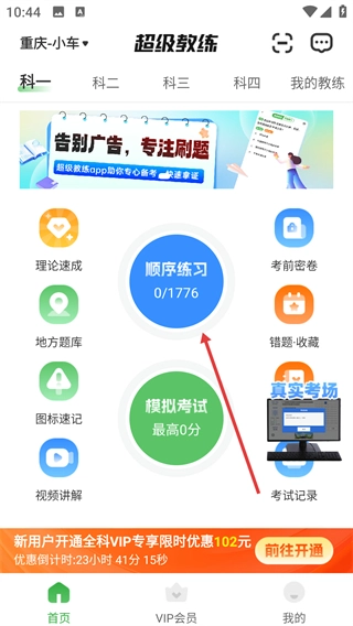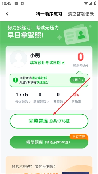 在顺序练习页面,点击【完整题库-共1776题】这个选项,就能进入科目一的答题模式了。