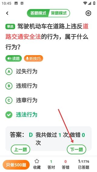 确认答案准确无误后,点击【下一题】按钮,继续进行后续的科目一题目练习,以积累答题进度。