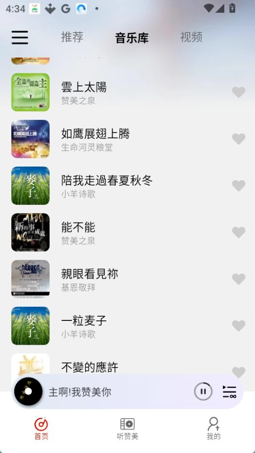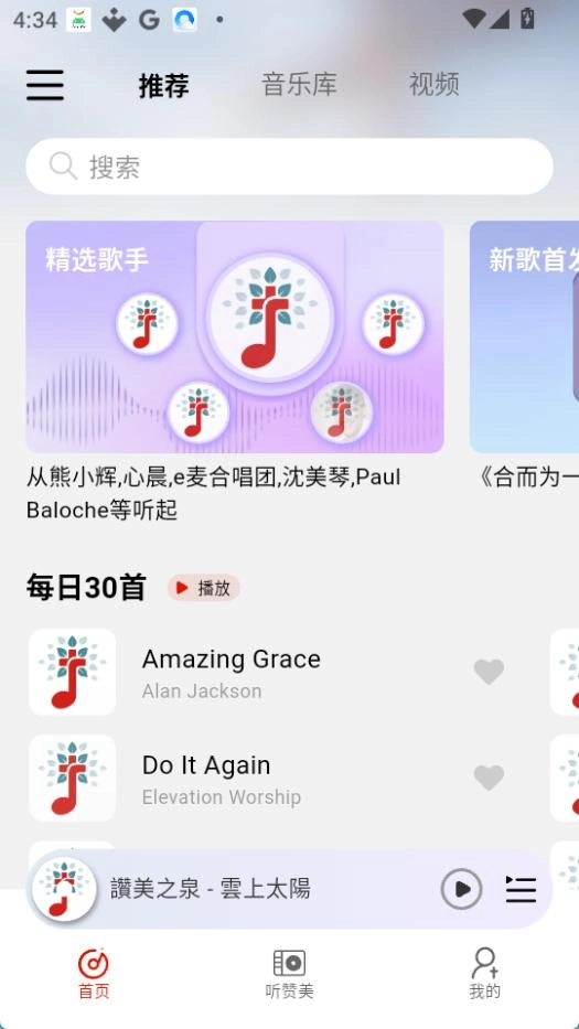 灵听设有听赞美功能模块,包含默认模式、熟悉模式与探索模式三种模式;此外,灵听支持自建歌单,登录账号后还能收藏歌单;若为长辈使用,可对字体大小进行切换调整。