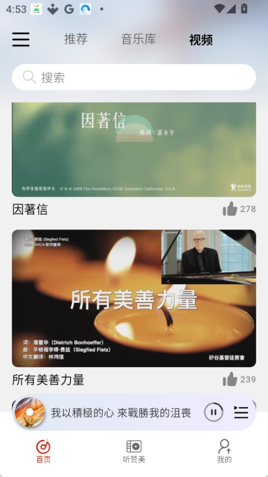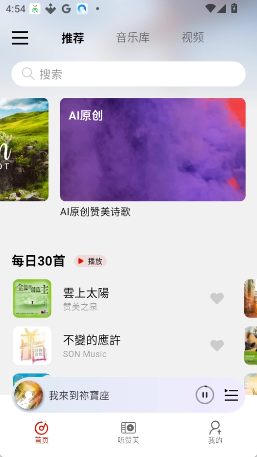 打开灵听,搜索并收听喜欢的音乐或诗歌。