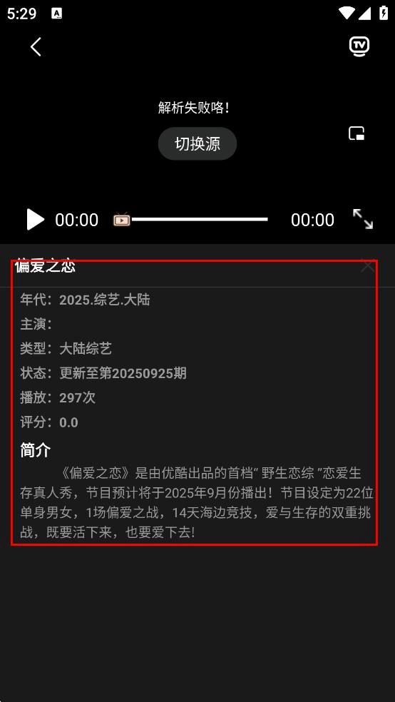 在播放页面,能够查看偏爱之恋的年代、类型、状态等信息以及简介。