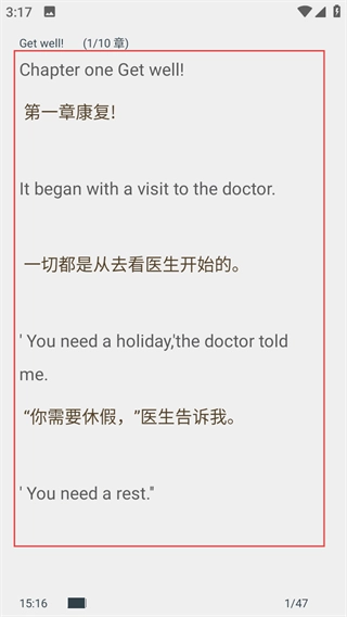 双语对照阅读功能:平台上的每本读物都配备了中文和英文的对照版本,用户可以根据自己的需求随时切换两种语言查看内容。当遇到不熟悉的词汇或者难以理解的复杂句式时,借助对应的中文释义就能快速掌握其含义,这样既能有效降低阅读过程中的障碍,也能帮助用户提升语言学习的效率。