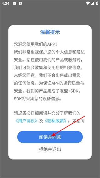 在温馨提示弹窗中,点击阅读并同意,进入首页。