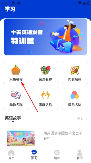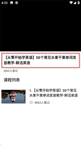 在水果名称相关的学习内容页面,能够查看从零开始学英语这类课程内容。