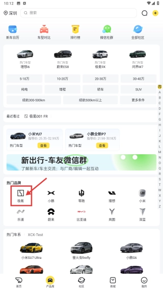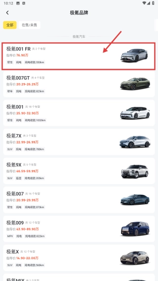 在选车页面,选择极氪品牌,进入极氪品牌车型列表页面。