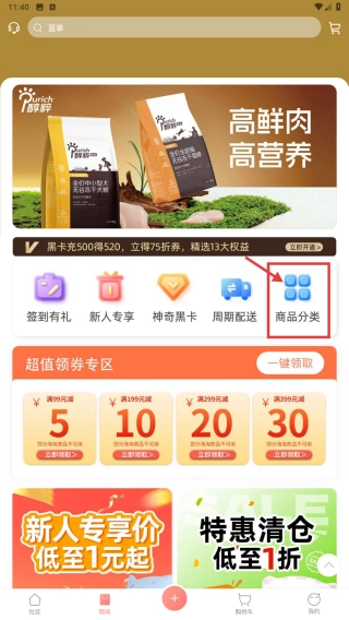 打开宠物类应用后,点击底部的商城选项,即可进入宠物商品商城页面。