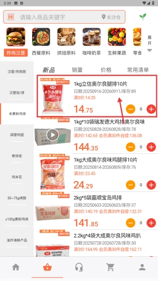 在商品浏览页面,点击左侧的未裹粉鸡排分类,即可筛选出对应的商品列表。
