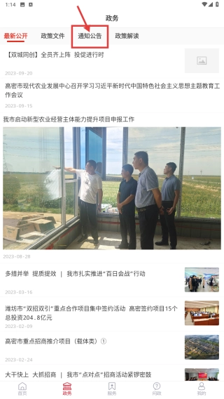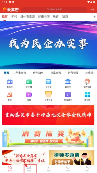 打开爱高密应用,在底部找到并点击政务选项,即可进入政务页面。