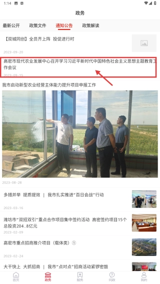 在政务页面,点击通知公告栏,进入查看详情。