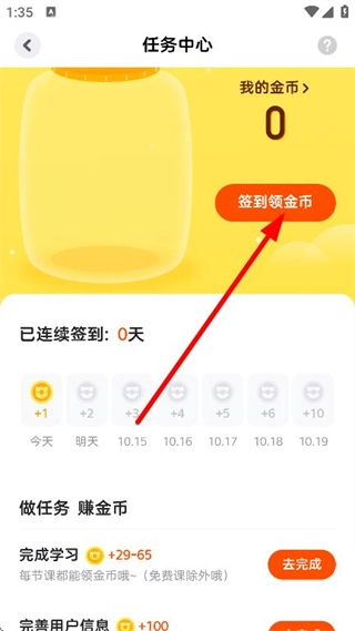 在任务中心,点击签到领金币,完成每日签到。