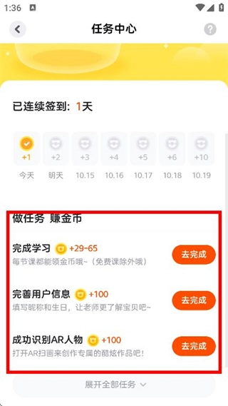 在任务中心的做任务板块,点击“去完成”按钮,通过完善用户信息等任务就能获取金币啦。