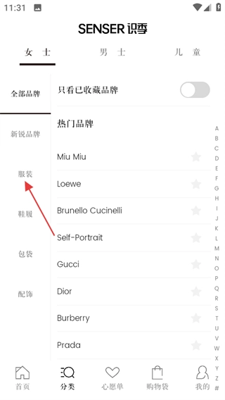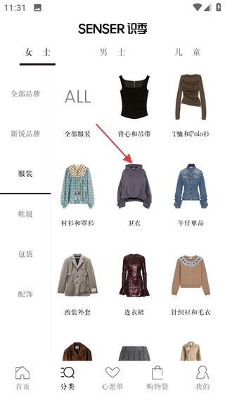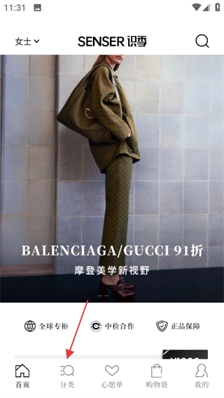打开SENSER识季首页后,点击底部的分类选项,即可进入分类页面。