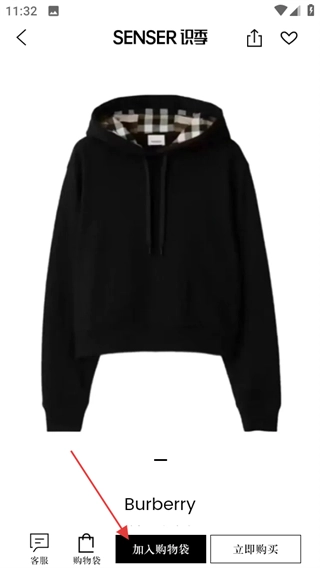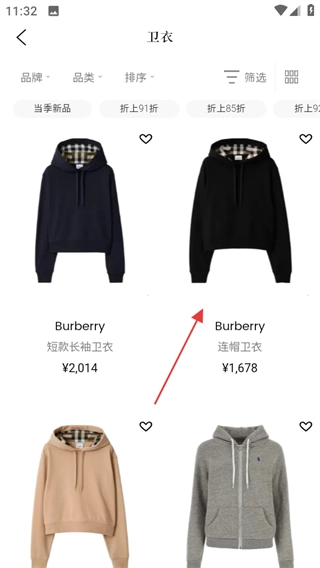 在卫衣商品列表页面,挑选自己感兴趣的商品,比如Burberry连帽卫衣,然后进入该商品的详情页面。