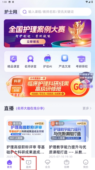 打开护理考试学习应用后,点击底部的题库选项,即可进入备考目标选择页面。