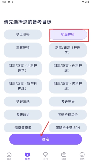 在备考目标页面,选定初级护师选项并点击确定,即可进入初级护师学习界面。