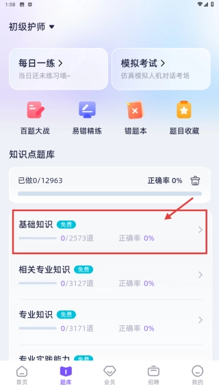 在初级护师界面,点击基础知识题库,进入练习题页面开始做题。