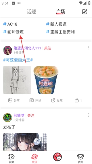 在发现页面的广场区域,点击“画师修炼”话题,即可进入对应的话题页面。