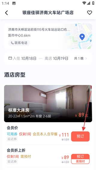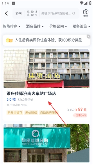 挑选自己喜欢的酒店,比如银座佳驿济南火车站广场店,然后进入这家酒店的详情页面。
