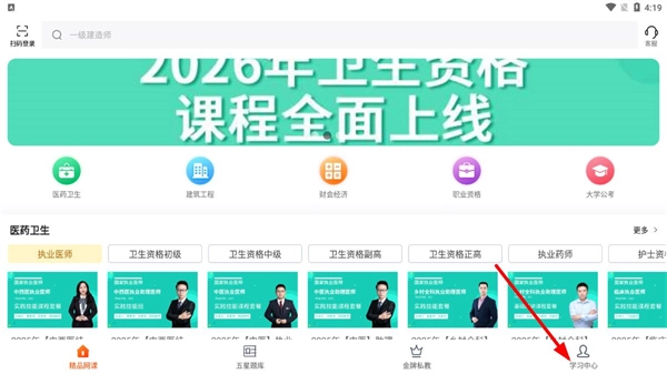 在学习软件的首页,点击右下角的“学习中心”按钮,即可进入学习中心页面。