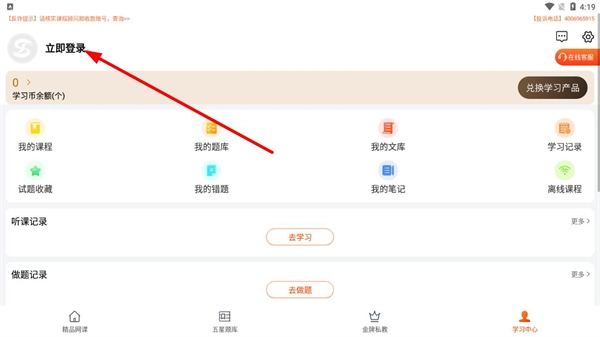 在学习中心页面,点击“立即登录”按钮,即可进入账号登录页面。